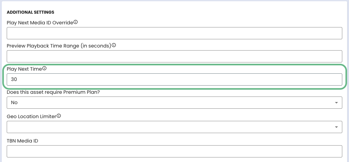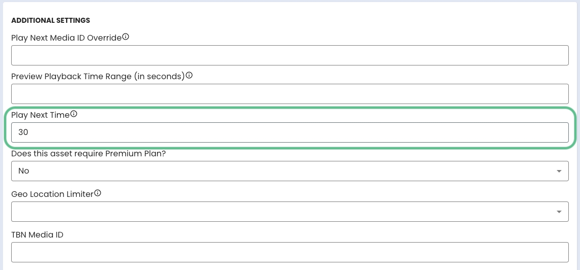 In the "Additional Settings" section, locate the "Play Next Time" field.