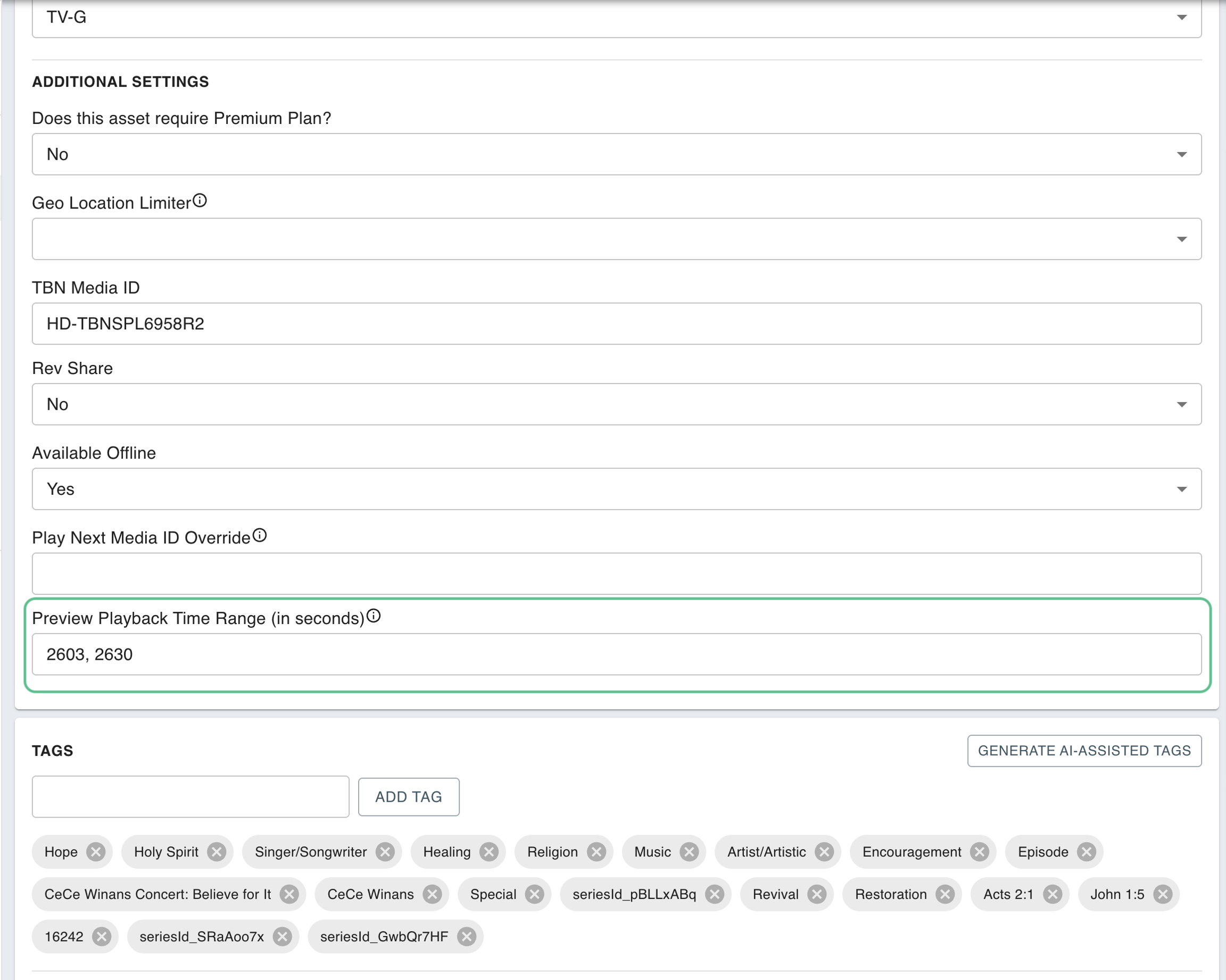 This field allows the user to select a range of time that will autoplay as the user scrolls over the media item in the featured carousel on CTV and Tablet platforms. By default, this field is blank and will only begin playing a preview once a time has been selected
