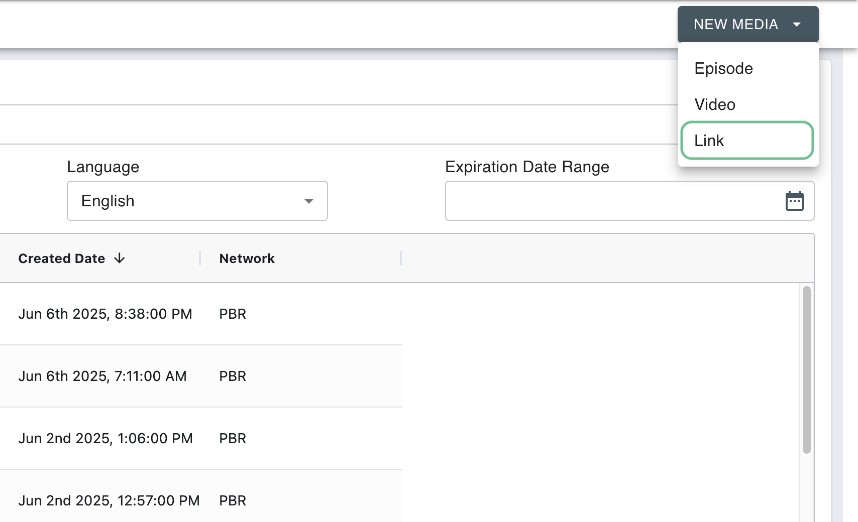Navigate to the Media Library in Backstage. Click "New Media" in the top right corner and select Link