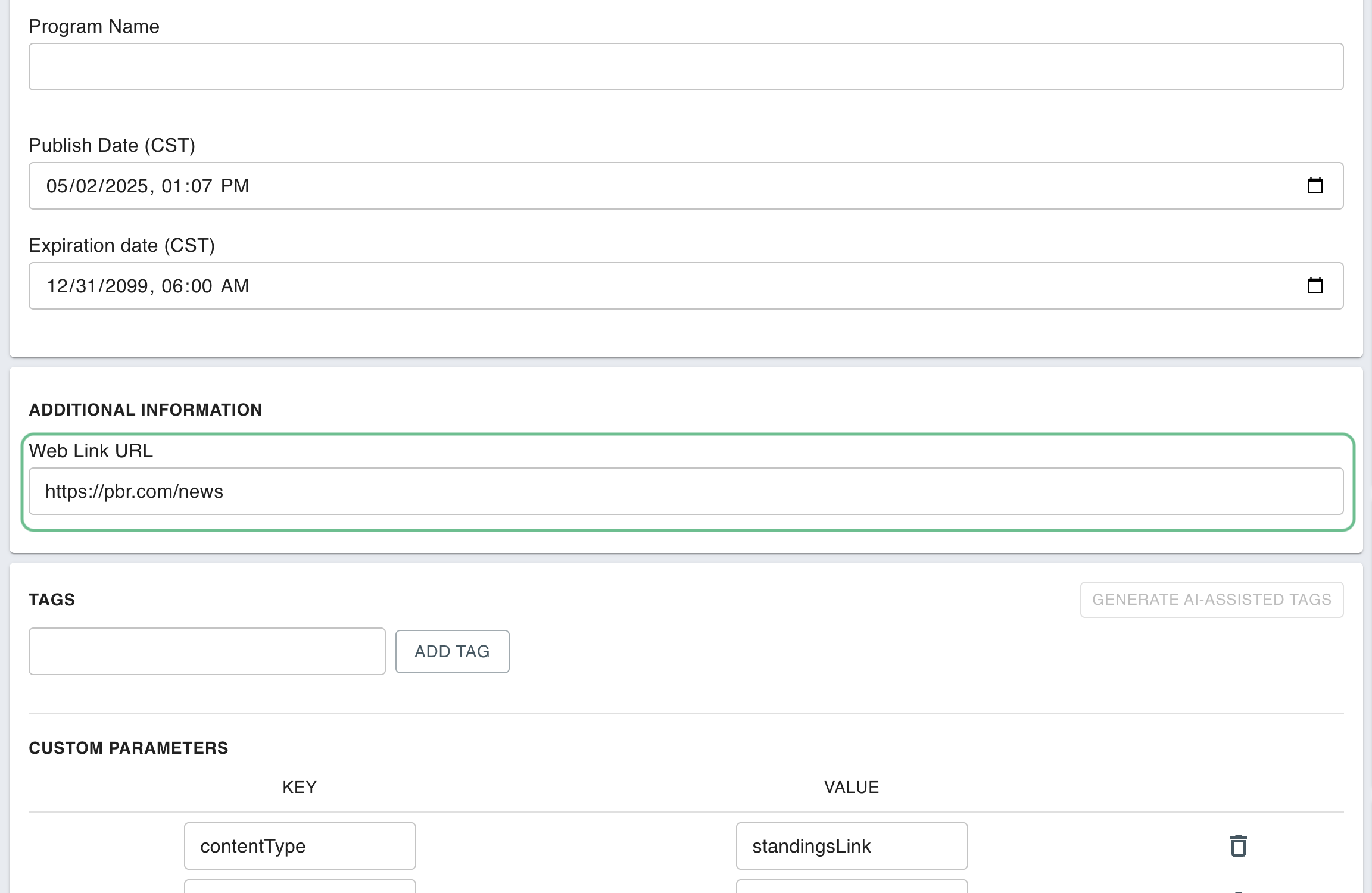 Title: Enter the text you want displayed as the clickable link in the appDescription: While required, this information won't be displayed to usersVideo Asset: Upload a placeholder video - this won't be displayed in the appWeb Link URL: Enter the destination URL in the "Web Link URL" field