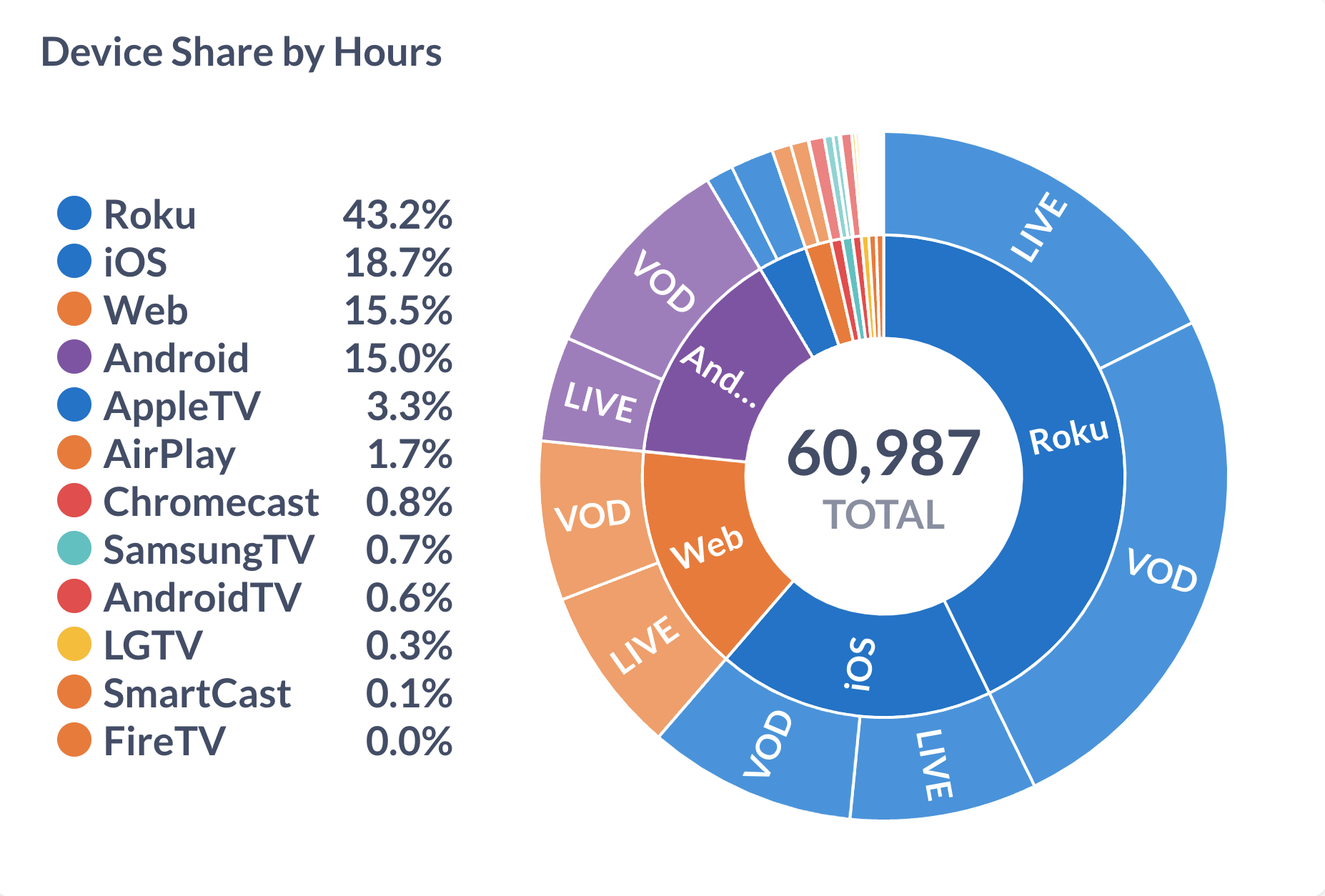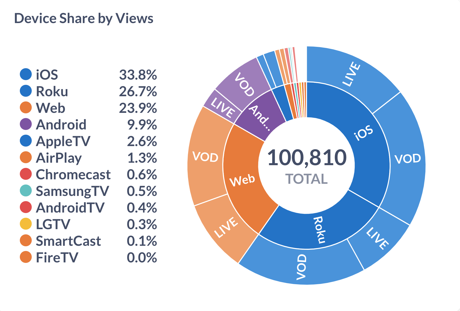 Outer Ring: Breaks down the type of content (Live vs VOD) consumed on each platform