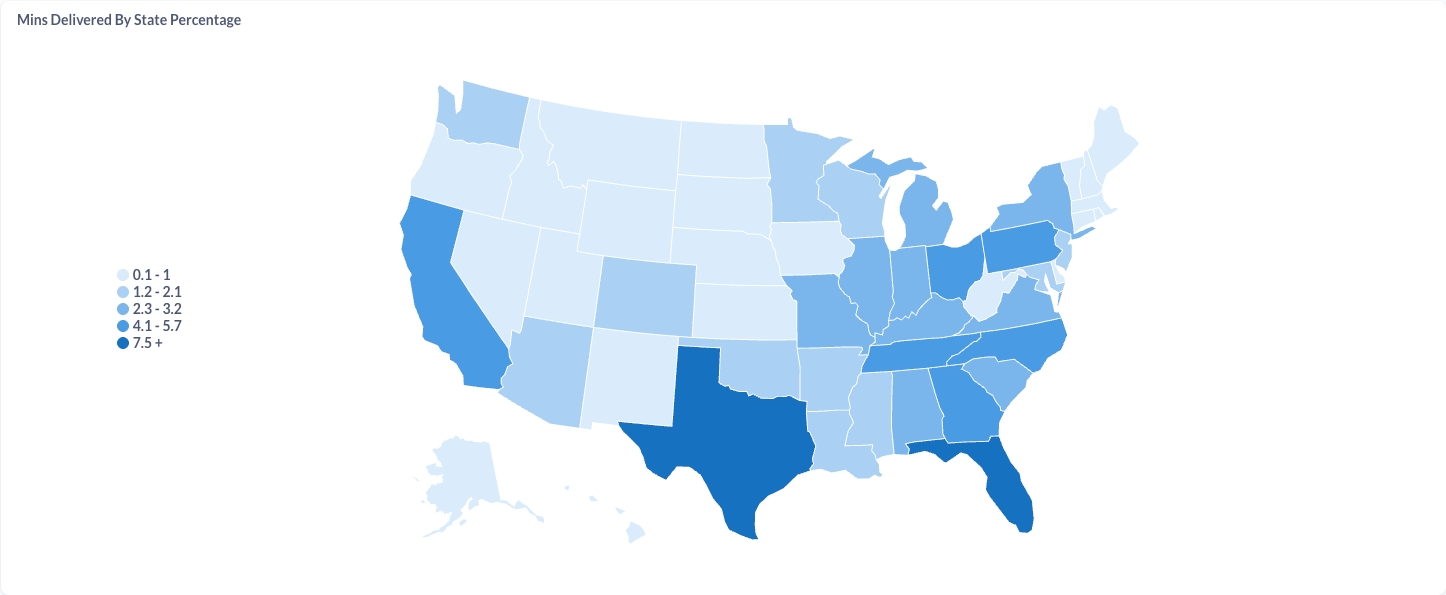 Minutes Delivered State: US-specific heat map showing state-by-state viewing patterns
