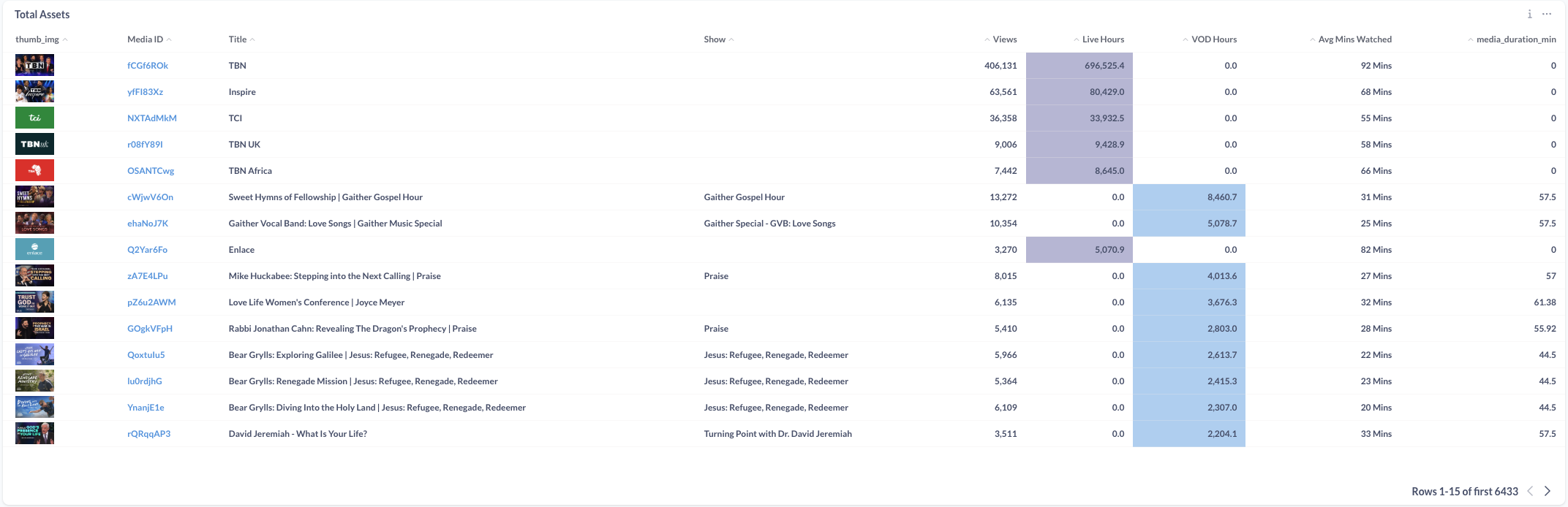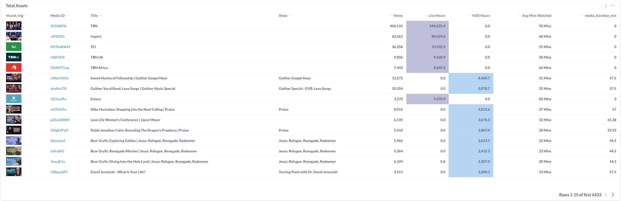 This section shows all assets based on performance (both VOD and Live) within your selected date range:
