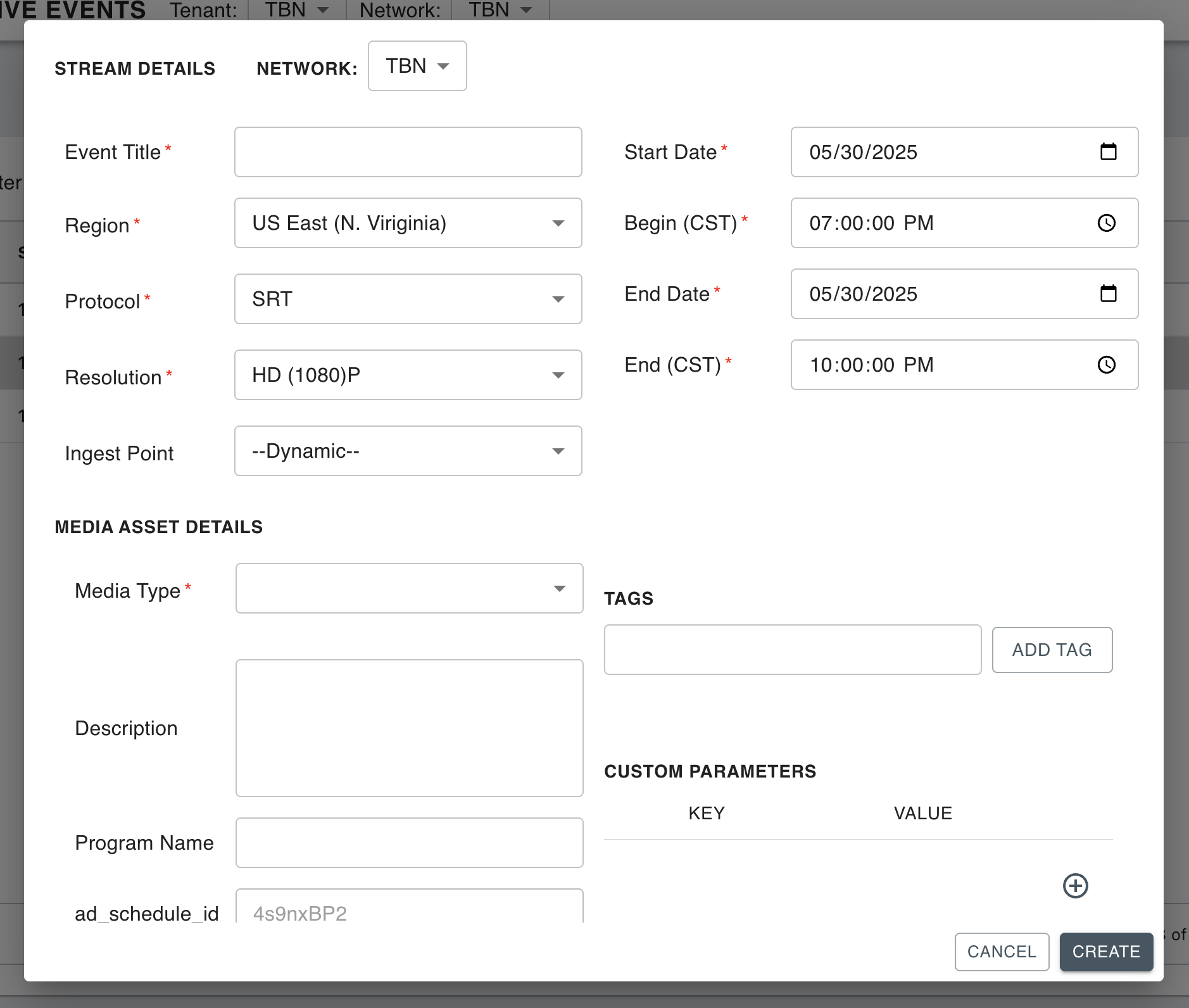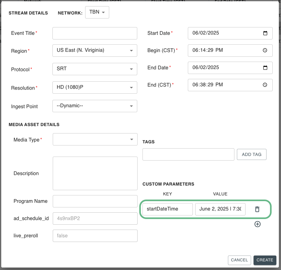 In the Media Asset Details section or when editing an existing event, navigate to the Custom Parameters.