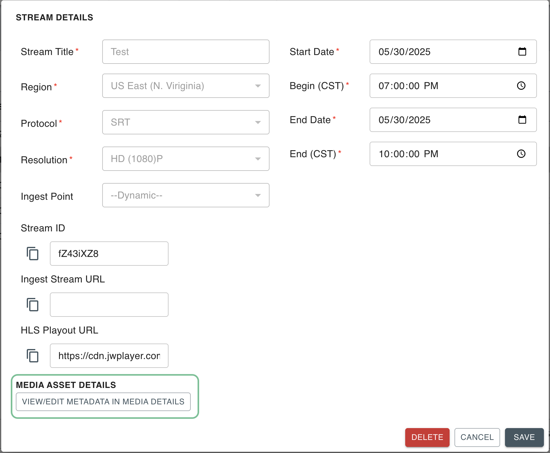A modal will appear with two main sections: Stream Details and Media Asset Details.
