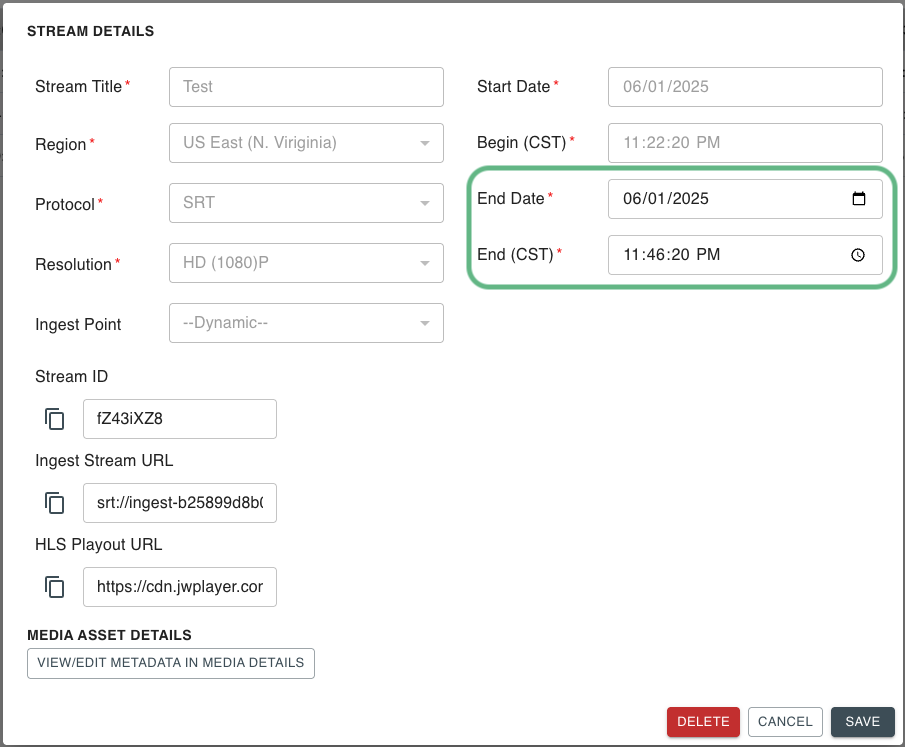NOTE: Start Date and Time are locked 15 minutes prior to the start of the Stream