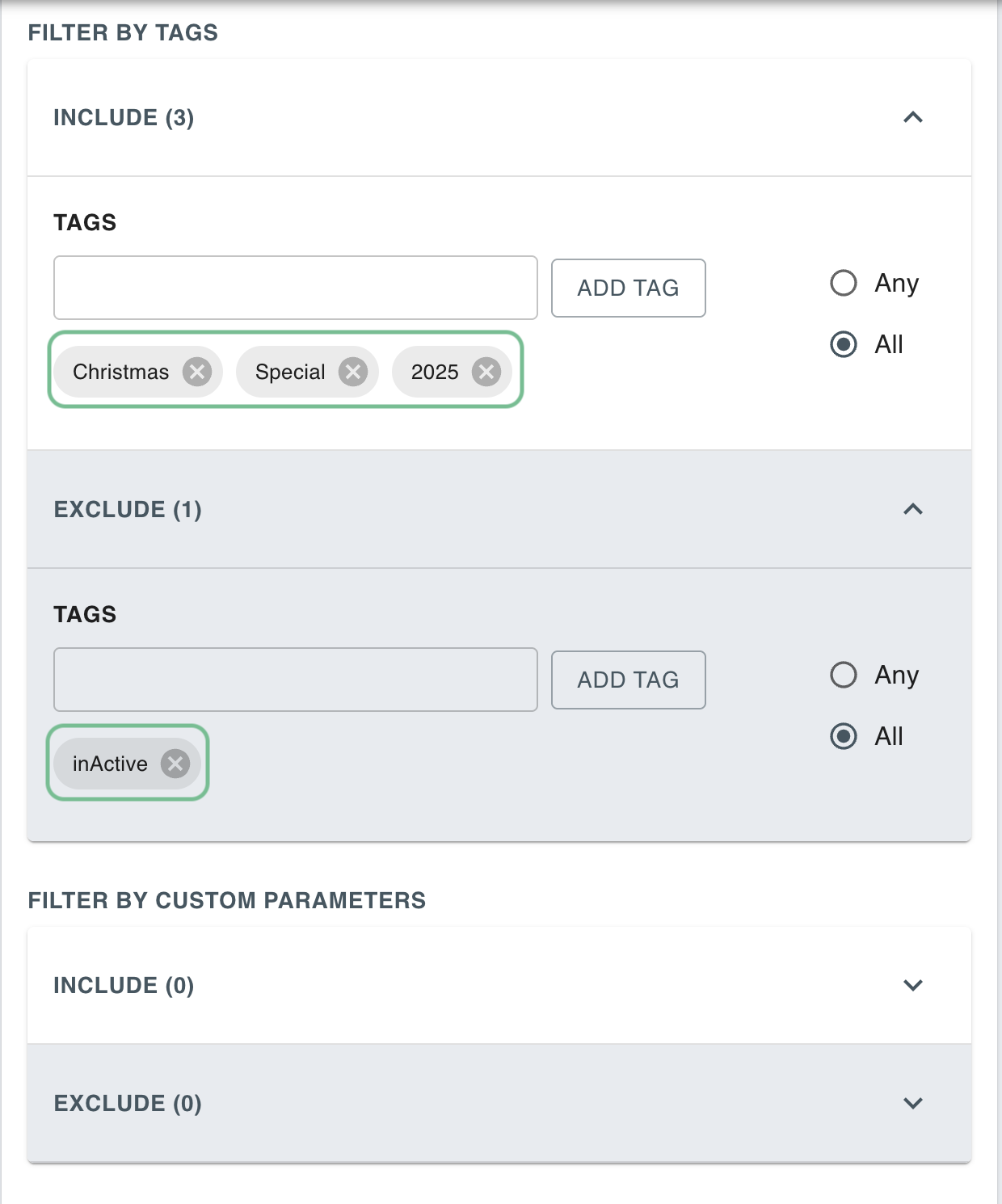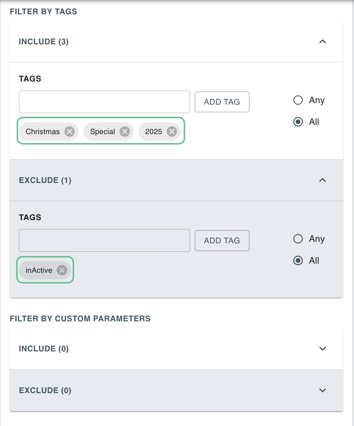 Note: For the "Include" and "Exclude" filters, ensure the proper "Any" or "All" option is selected for accurate filtering.