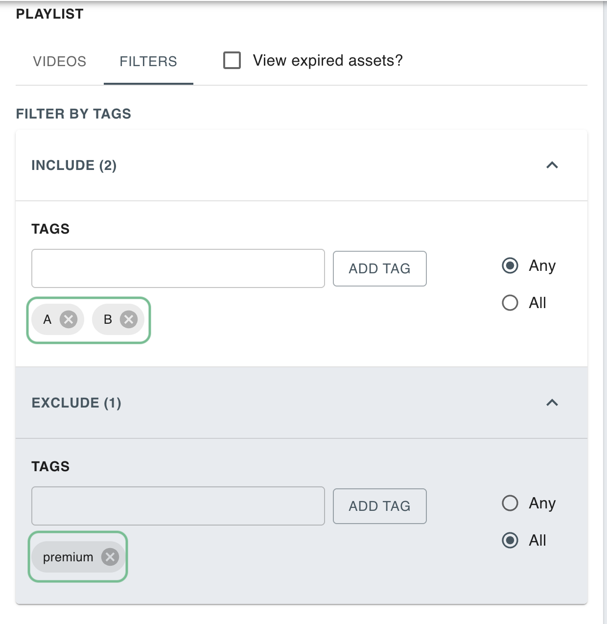 Configure "Exclude" filters to specify which tags will disqualify content from appearing in the playlist