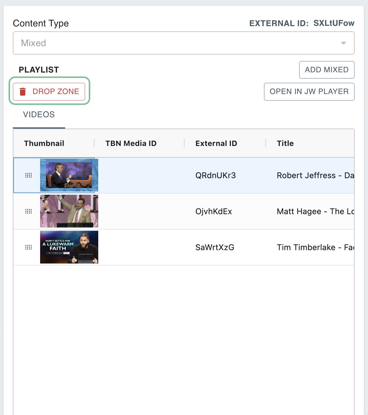 To remove content from a playlist, hover your mouse over the dots and drag it up to the drop zone, which will delete the asset from the playlist.